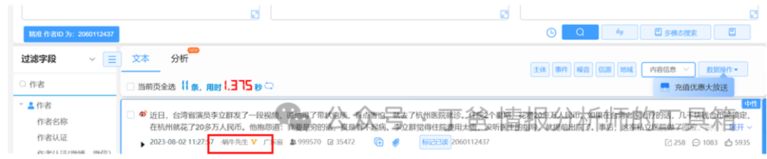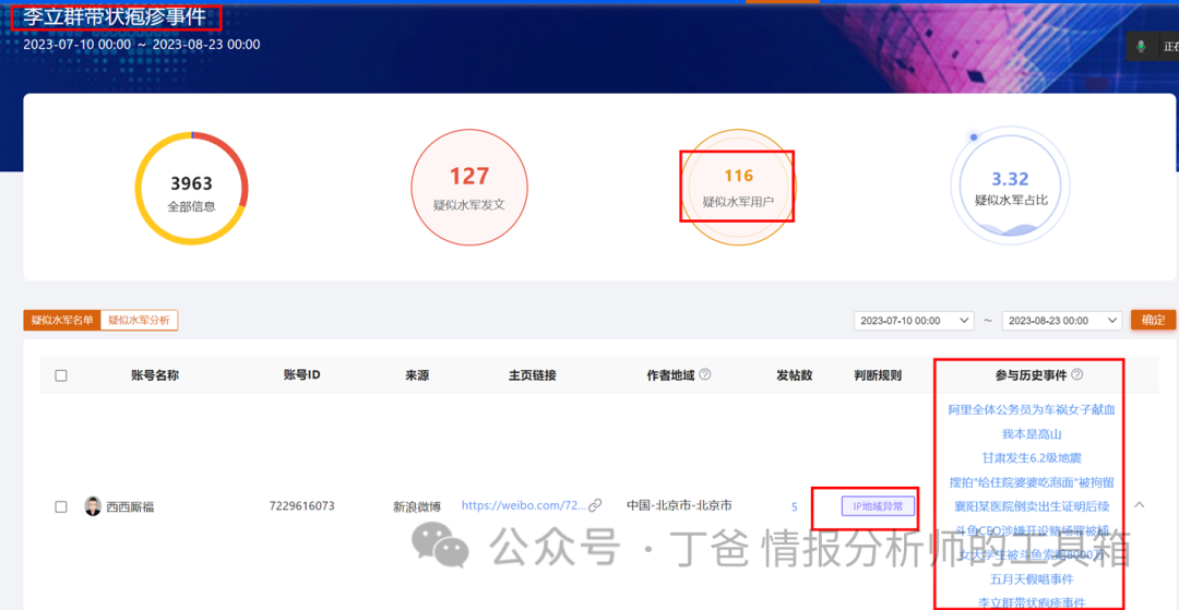 利用工具的事件分析功能,新建一个“李立群带状疱疹事件”对涉及该事件的所有账号数据进行采集分析,发现有116个疑是水军账号发帖127篇。