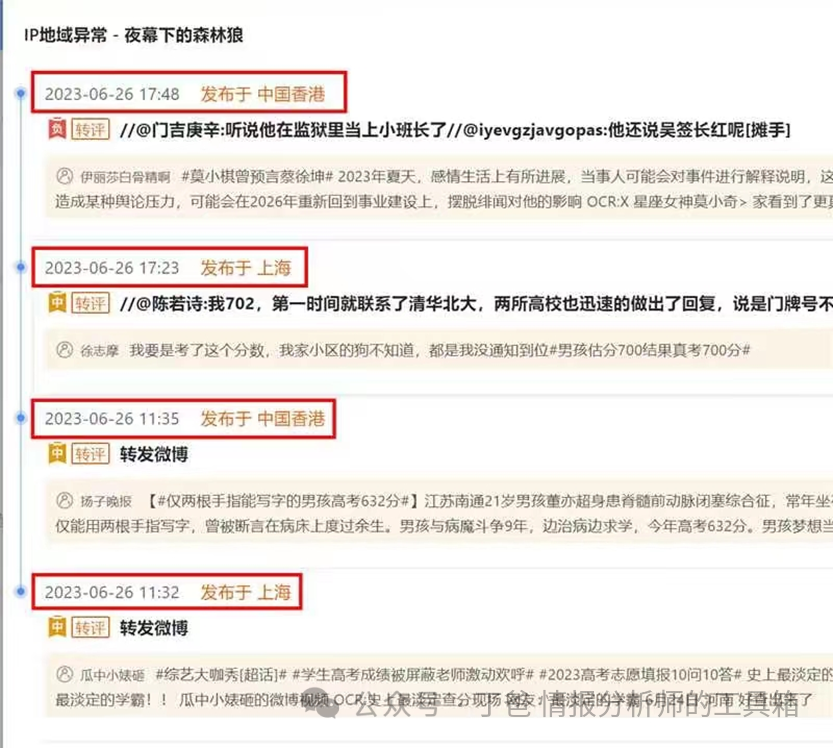 这些账号发帖IP在极短时间内大范围跨越多地,符合使用IP代理隐藏真实IP情况,符合水军账号特征。