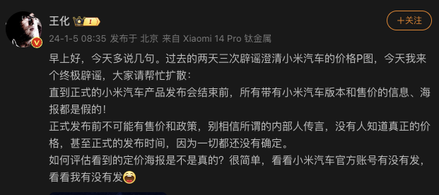 1 月 5 日,小米集团公关部总经理王化发文称,过去的两天 3 次辟谣澄清小米汽车的价格 P 图,今日终极辟谣:直到正式的小米汽车产品发布会结束前,所有带有小米汽车版本和售价的信息、海报都是假的。正式发布前不可能有售价和政策,别相信所谓的内部人传言,没有人知道真正的价格,甚至正式的发布时间,因为一切都还没有确定。王化称,真正的定价海报,只用关注小米汽车官方账号或其本人账号即可。华为问界 M9 的竞争目标:理想 L9 和 MEGA