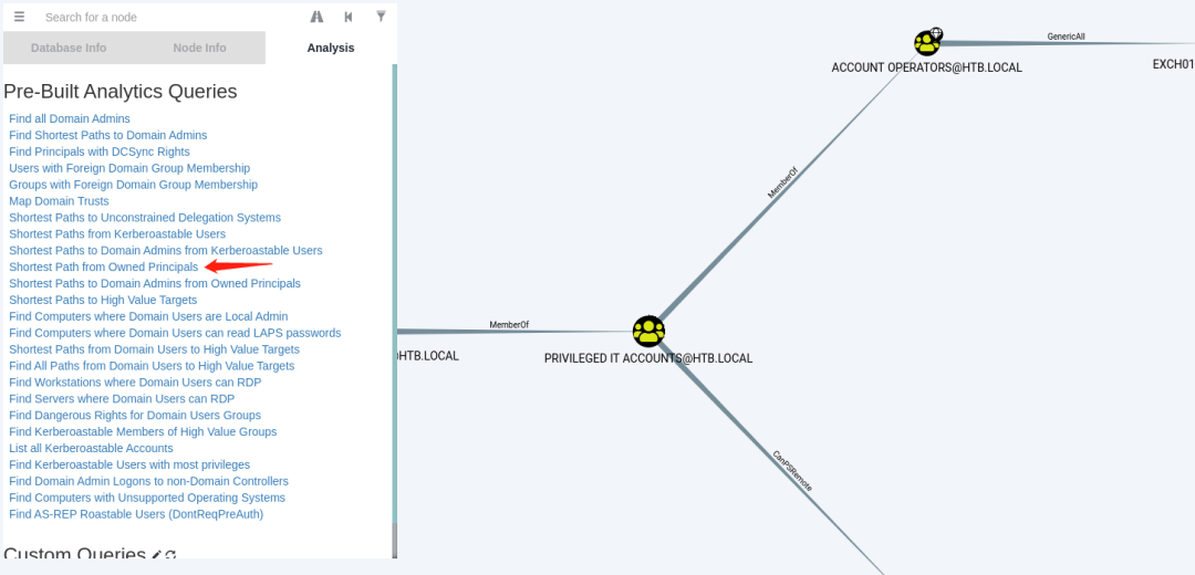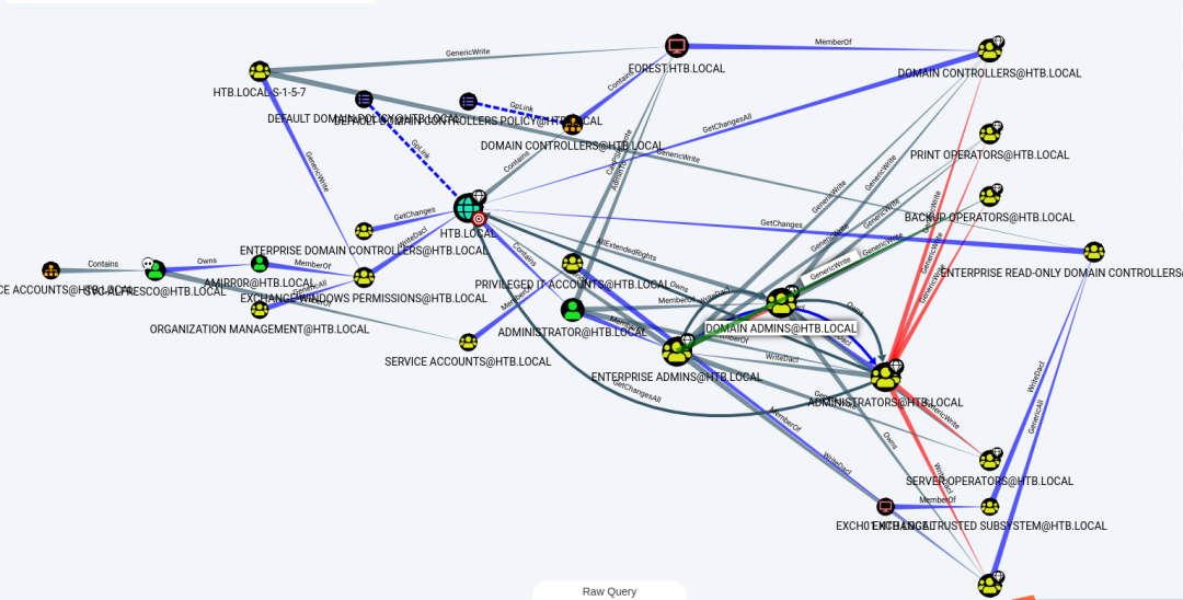 Shortest Paths to High Value Targets,查看去往高权限目标的路径。该用户具有GenericAll的权限和Exchange Windows权限组。在Exchange Windows权限组具有WriteDacl在域的权限。该WriteDacl权限使用户能够向对象添加DACL(自由访问控制列表)。那就意味着: