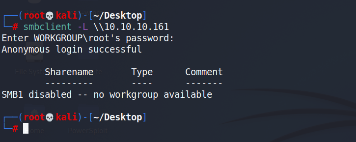 我们发现可以进行匿名登录,我们尝试匿名登录SMB服务,看看有哪些有价值的信息答案是没有,没有什么共享信息