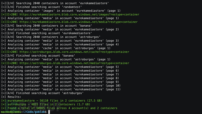 $ ./goblob -accounts accounts.txt -containers wordlists/goblob-folder-names.txt -output results.txt如果你想好通过stdin提供目标账号,你还可以直接忽略-accounts选项或账号名称: