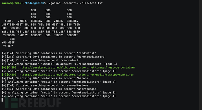 $ ./goblob -accounts accounts.txt默认配置下,该工具将会使用一个包含常见Azure Blob存储容器名称的列表来构造出潜在的URL地址。不过,我们也可以使用-containers参数来指定一个自定义的容器名称列表: