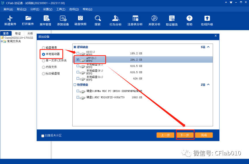 注意: 此方法只适用于邮箱在线但忘记登录密码的情况。邮箱已经退出却忘记密码的情况只能通过账户重置来解决。主要工具:CFlab法证通电子数据取证与综合分析系统选择本地驱动,选择Foxmail程序所在磁盘,点击下一步![]()