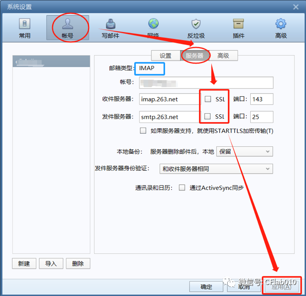 三、通过抓包工具(Wireshark)抓取明文数据打开Foxmail,进入账号管理,将账号管理中的SSL两个端口的勾选去掉,如果不去掉就抓到的包就没有明文密码,这一步很重要,设置完以后要记得保存。通过foxmail的账号管理我们可以看到邮箱类型为:IMAP。![]()