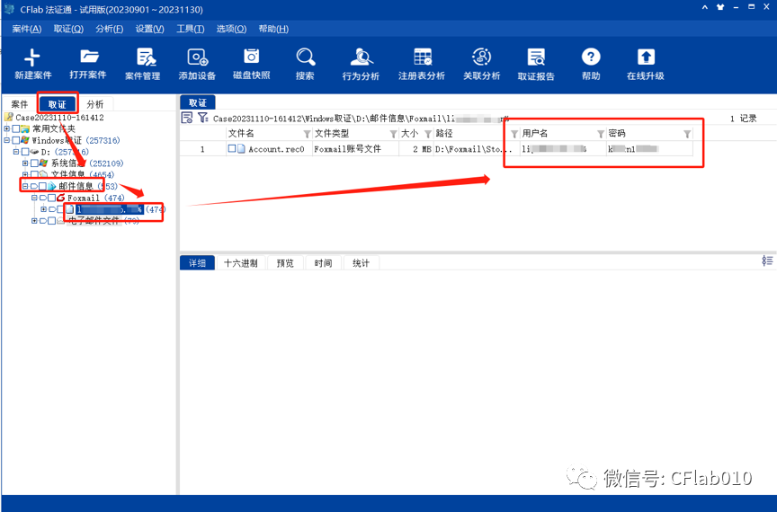 等待系统提取分析完毕后,在取证模块找到邮件信息,选择Foxmail,即可看到Foxmail的邮件密码以及收发邮件内容等。
