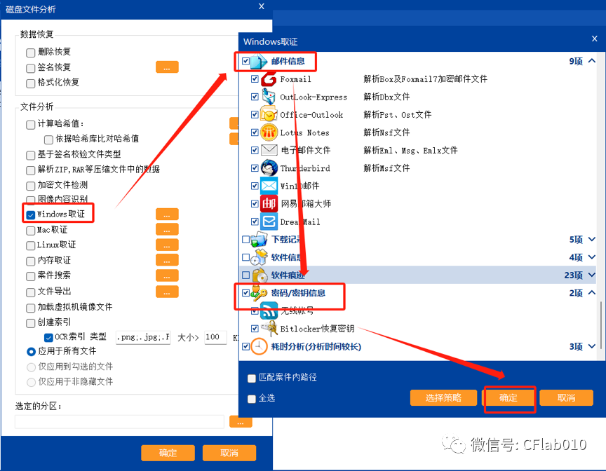 勾选Windows取证,选择邮件信息以及密码/密钥信息作为提取分析内容