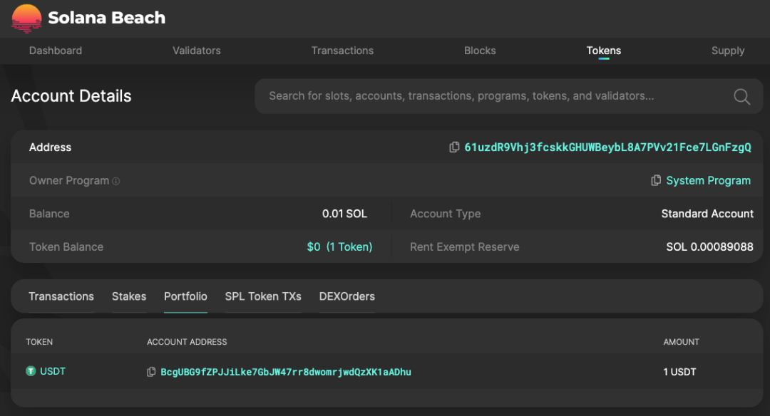 我们可以使用 Solana Beach 浏览器,通过输入数据账户的地址,点击 Portfolio,就可以清晰地看到每个 token-account,每个账户记录着特定 Token 的余额。