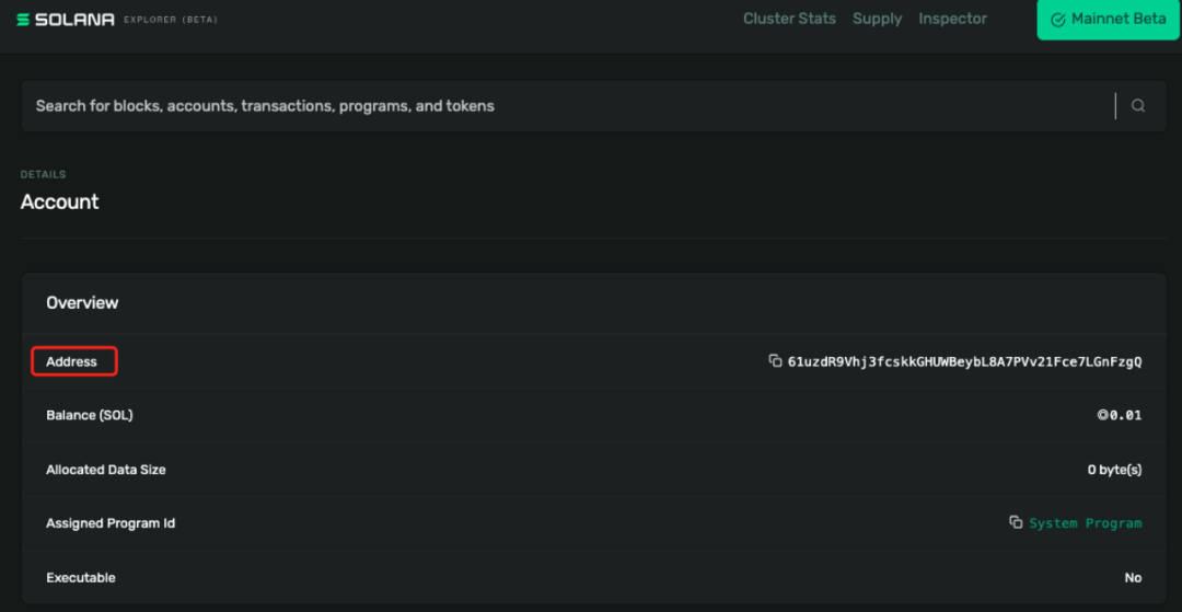 以 Solana Explorer 为例,普通用户使用的账户,即系统所有账户,在浏览器上的展示如下图: