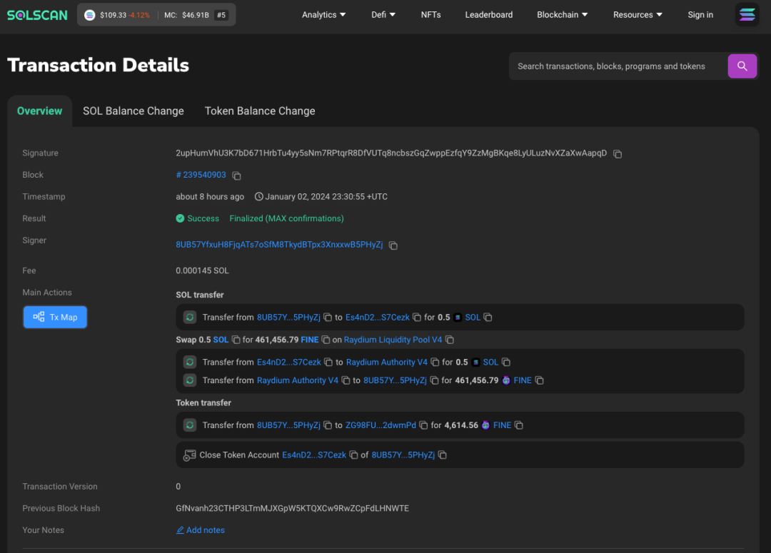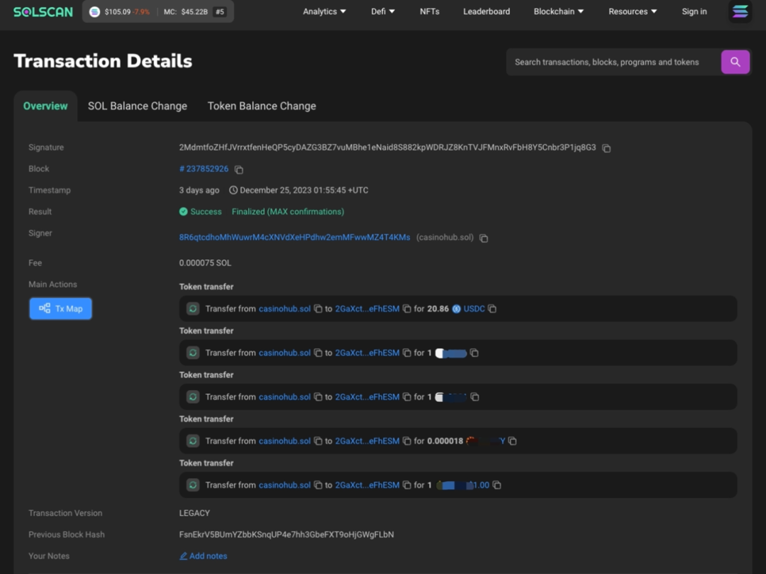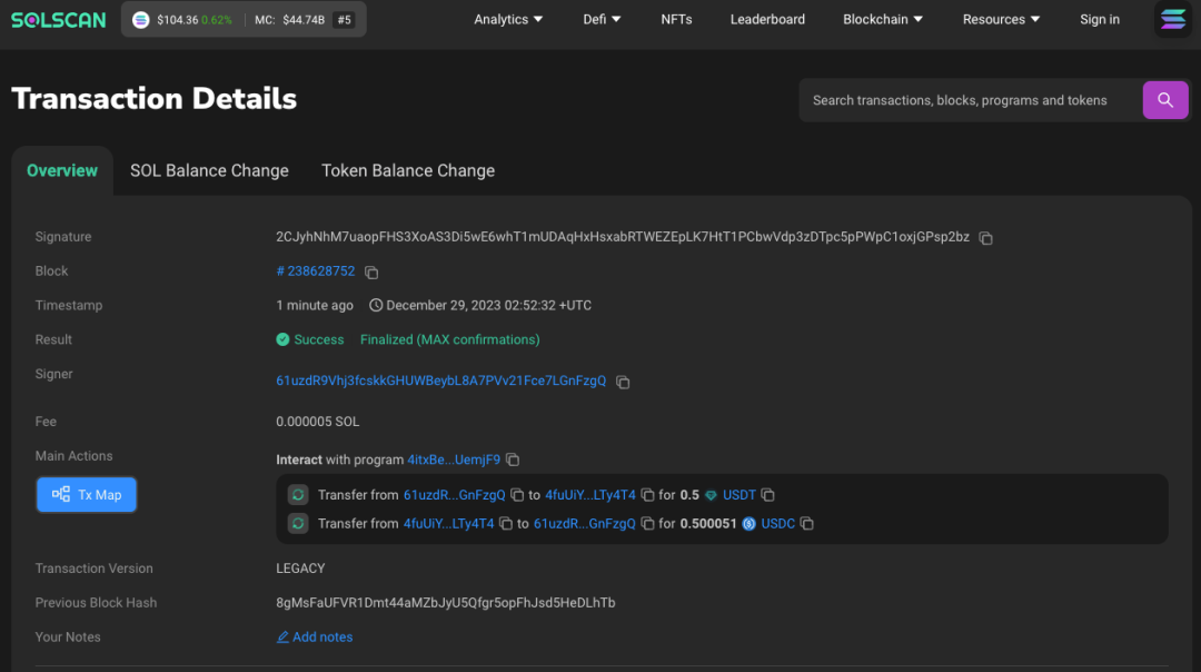 对于 Solana 上的交易记录,我们以 SOLSCAN 浏览器为例,关注以下主要信息: