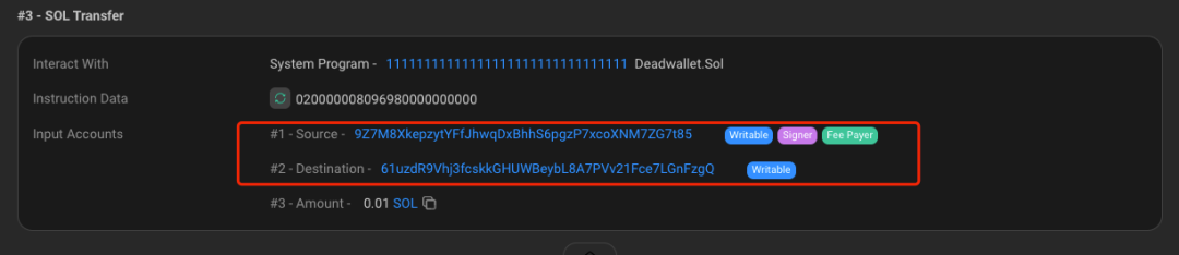 在 Instruction Details 中,我们可以看到 SOL 转账交易的主要指令是 SOL Transfer,该指令旨在进行 SOL 的转账。通过详细查看该指令的详情,我们可以获得有关该指令调用的程序,以及涉及到的转账双方的账户地址等信息。