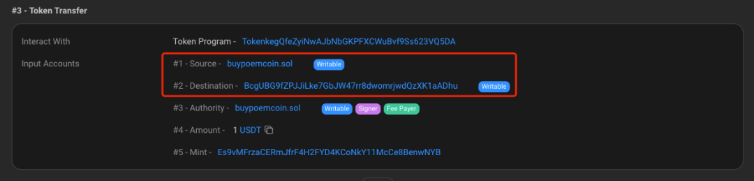 接着执行 Token Transfer 指令,完成 USDT 的转账。值得注意的是,与 SOL Transfer 指令不同,Token Transfer 指令中的 Source 和 Destination 不代表转账双方的直接账户地址,而是它们的 Token 账户(PDA 账户),这点需要特别注意。