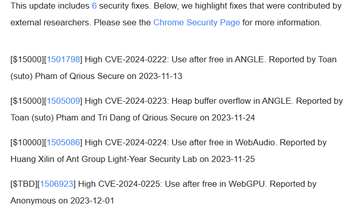 谷歌最近发布了2024年的首个Chrome安全更新,以修复六个漏洞,其中有四个是由外部研究人员所报告的,这四个都是高危的内存安全漏洞。谷歌公告中未有提及此次Chrome更新中修复的漏洞是否已被利用。