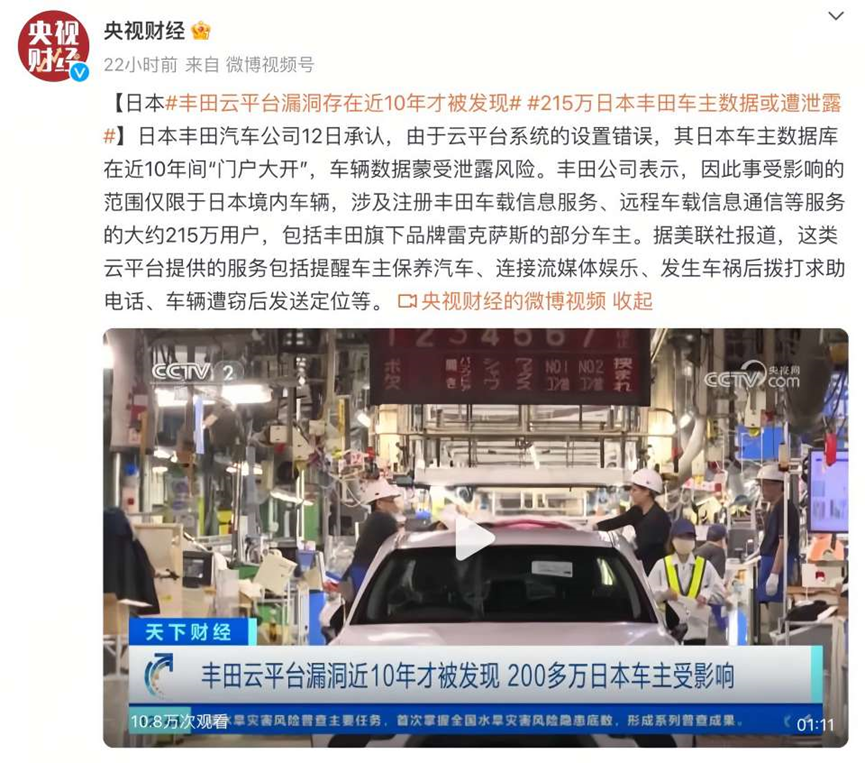 5月15日,丰田汽车因云环境中的设置错误,导致车辆数据存在泄露风险。丰田公司表示,因此事受影响的范围仅限于日本境内车辆,涉及注册丰田车载信息服务、远程车载信息通信服务等服务的大约215万用户,包括丰田旗下品牌雷克萨斯的部分车主。丰田同时表示,目前数据并没有被恶意使用的报告。