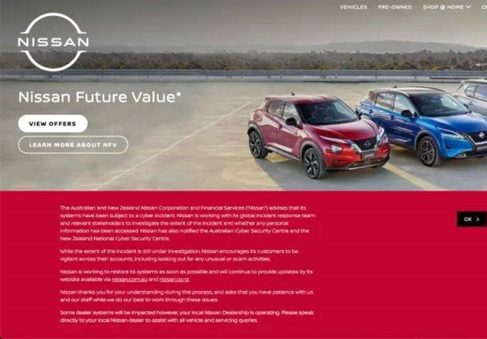 12月7日,日产(Nissan,即尼桑)正在调查针对其在新西兰和澳大利亚的系统的网络攻击。在澳大利亚官网发布公告,确认公司遭受了一次“网络攻击”,并警告客户他们的个人信息可能已被访问。据了解,这次网络攻击影响了日产在澳大利亚和新西兰的系统,而且日产经销商的系统可能也受到了此次事件的影响。