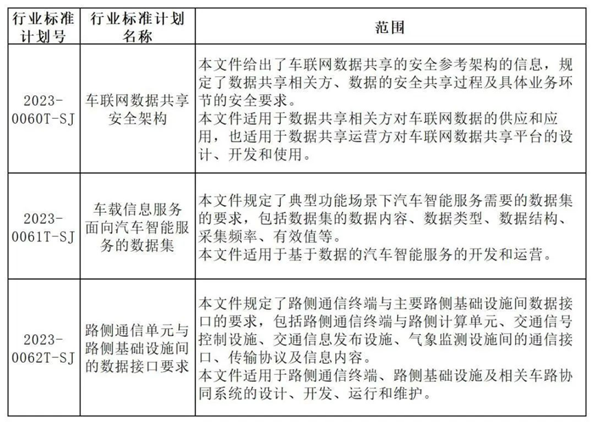 会议分别成立了《车联网数据共享安全架构》《车载信息服务 面向汽车智能服务的数据集》《路侧通信单元与路侧基础设施间的数据接口要求》等三项行业标准编制组,确定工作计划,正式启动了标准研制工作。三项标准具体情况如下表所示。