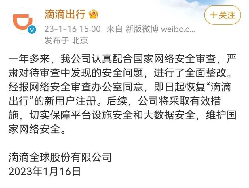 时隔一年半,滴滴出行重新恢复用户注册。1月16日,滴滴在官方微博发布公告称,过去一年多,公司认真配合国家网络安全审查,严肃对待审查中发现的安全问题,并进行了全面整改。经报网络安全审查办公室同意,即日起恢复“滴滴出行”的新用户注册。事实上,此次公告发布前夕,滴滴重新恢复上架的消息已经在业界流传。