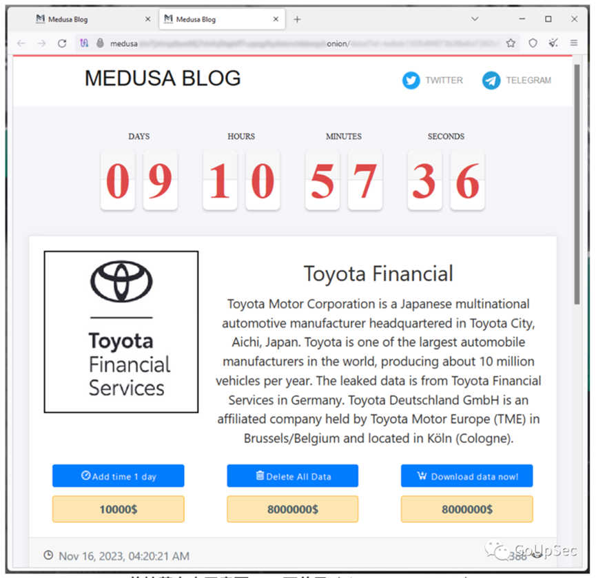 11月16日,丰田金融服务公司(TFS)证实遭遇Medusa(美杜莎)勒索软件组织的攻击,该公司在欧洲和非洲的系统上检测到未经授权的访问。丰田金融服务公司是丰田汽车公司的子公司,作为一家全球性企业,其业务覆盖丰田汽车90%的市场,为丰田客户提供汽车融资服务。Medusa勒索软件组织在其暗网数据泄漏站点的受害者名单中添加了丰田金融服务公司,要求后者支付800万美元赎金来删除泄漏数据(下图):