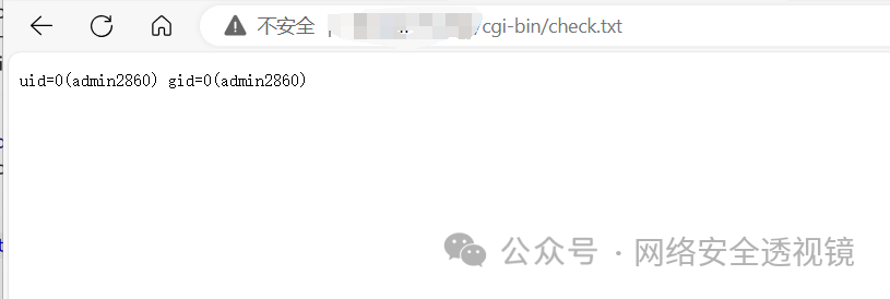 执行成功后,访问路径 /cgi-bin/check.txt 如果文件存在则漏洞存在