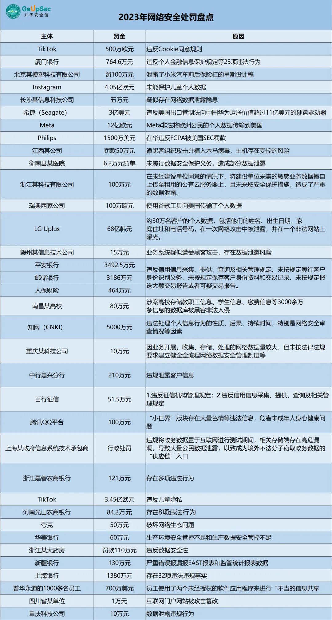 随着各国网络安全法规的不断健全,数据监管力度不断加大,对数据泄露事件的处罚愈加严厉,以下我们整理了2023年的国内外网络安全事件处罚案例,供大家参考借鉴,敲响警钟。新的一年,网络空间安全不仅依靠政府监管,更需要企业、社会组织、技术社群和公民个人等网络利益相关者的共同参与!