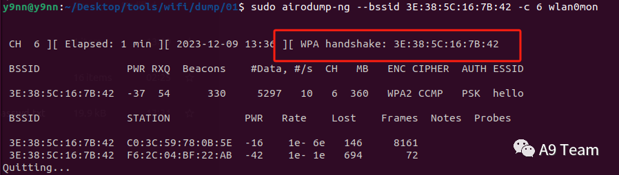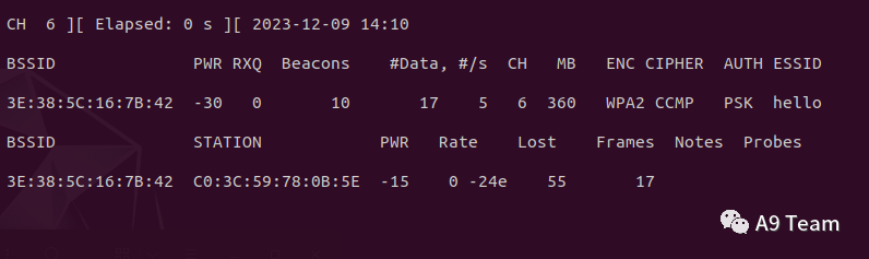 airodump-ng wlan0mon图中可以看到目标wifi的相关信息