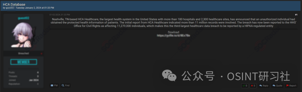 HCA Healthcare 数据重新浮出水面(2024 年 1 月 2 日):在 2023 年 7 月发生的最重大的医疗保健漏洞之一中,HCA Healthcare 遭受了黑客攻击,影响了1100 万患者的数据。此次泄露包括患者姓名、联系信息和预约详细信息,凸显了潜在的患者数据泄露的规模。该数据之前曾在暗网上被检测到,但最近又继续被发布。