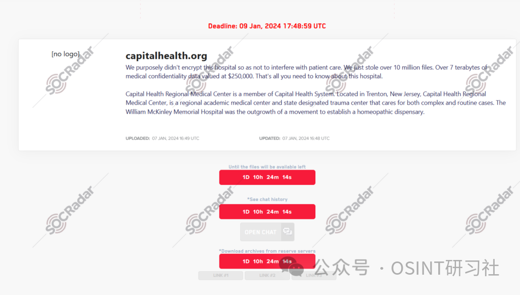 Capital Health(2024 年 1 月 7 日): LockBit勒索软件组织针对 Capital Health,在不部署勒索软件的情况下窃取机密患者数据。这种在不中断运营的情况下窃取数据的方法表明了他们对关键数据和患者的敏感度,但不足以阻止他们窃取数据。