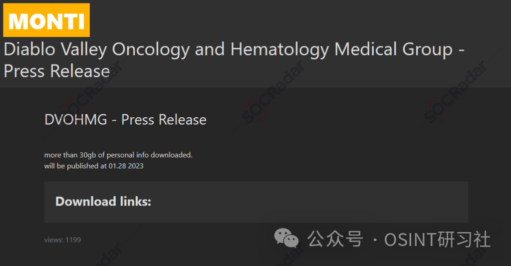 Diablo Valley Oncology(2024 年 1 月 4 日): Monti 勒索软件组织声称从 Diablo Valley Oncology窃取了超过30 GB 的个人信息。他们威胁公布这些敏感数据,凸显了医疗保健行业数据泄露的风险日益增加。