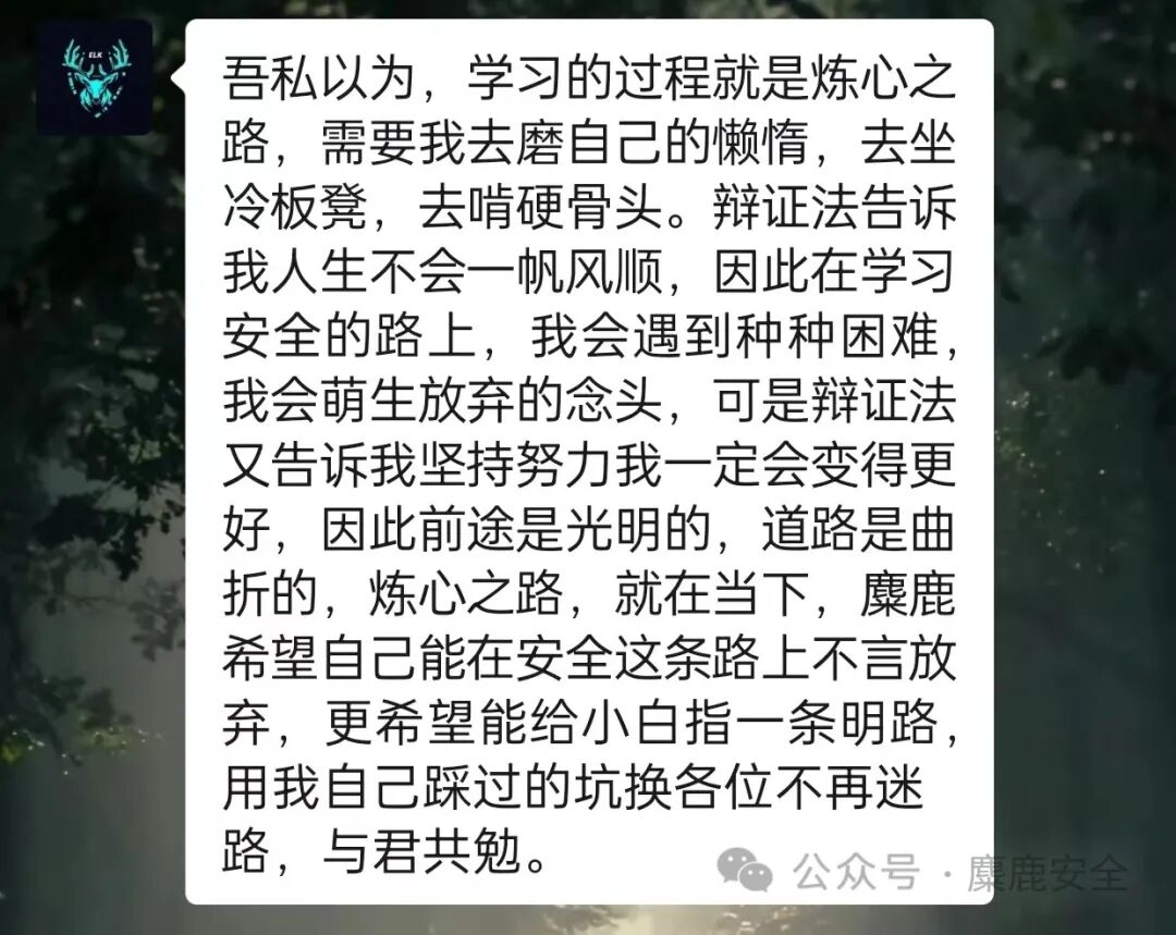 如果不想止步于驻场,止步于安服,那么你就要付出应该有的努力,去啃之前不敢碰的硬骨头,麋鹿自认为自己水平不是很强,我不满足于现状,所以我经常研究一个漏洞,或者看一个代码到深夜。我有一段刻骨铭心的记忆,那是我成长最快的一段经历,当时一个月平均每日睡眠时间不超过四个小时,每日工作超过12h,而且每日回到出租屋还要继续学到三点,然后早上不到七点起来去挤地铁上班。