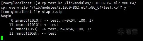 接下来,编译test.c->加载test.ko->执行x.stap(此刻,我还在一个思维陷阱里,以为加载驱动,是stap追踪该驱动的前提):