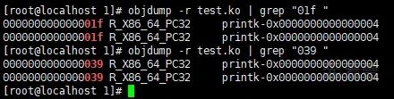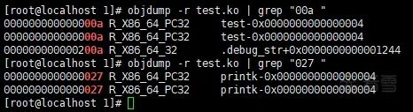 可以看出,调用test()的call指令,在test_init()和test_exit()函数中的偏移,都是0x1e,那么0x1f处一定有对应的重定项(这里需要一点链接原理的知识,可以看看我写的"32位elf格式中的10种重定位类型(https://bbs.kanxue.com/thread-246373.htm)"):