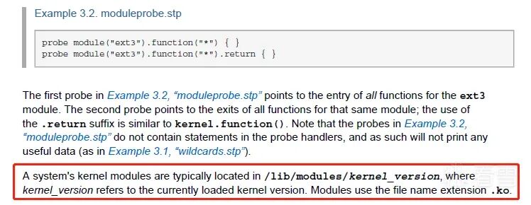 官方文档中的这么一句话,虽然只是阐述了一个客观情况,并没有表达,.ko文件一定要放在/lib/modules/$(uname -r)/目录,才能被追踪的意思,但是test.ko和xfs驱动相比,目前能想的的区别,也就这个了,所以就侥幸的试了一下,竟然成功了: