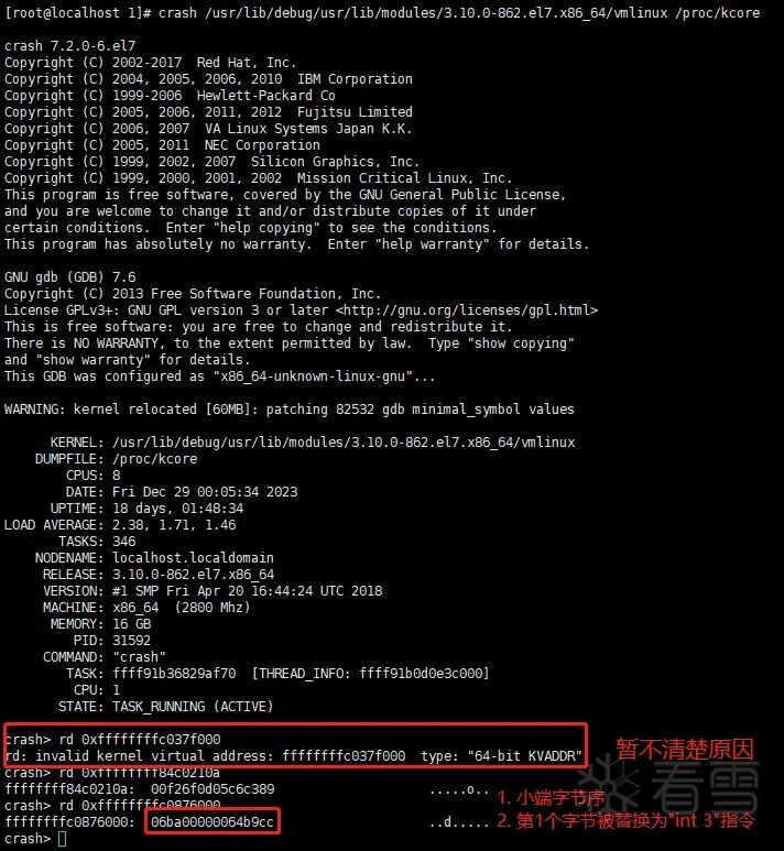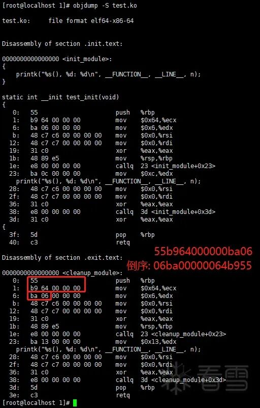 ③ 查看这两个内存地址的内容,与test_init()/test_exit()函数反汇编的机器码对比(这种方式要求系统安装了内核debuginfo)