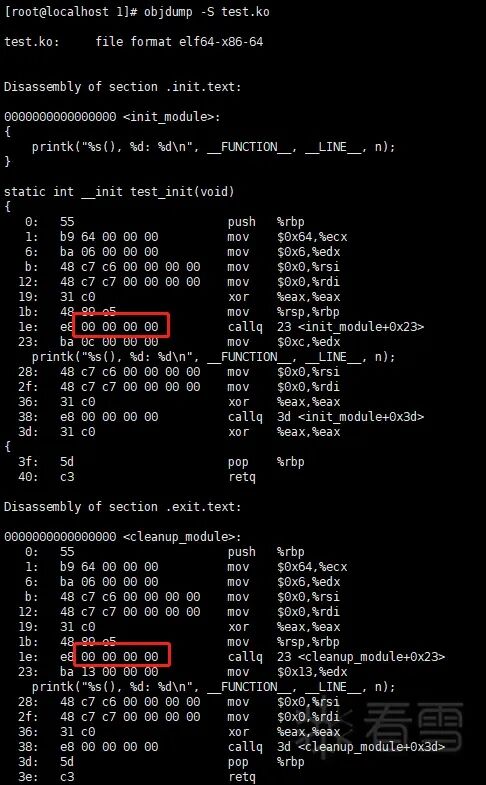 最终得出,0x1f处,原本应该填充为test()函数地址,但是却被直接填充为printk()函数的地址了,所以大致可以推测,可能由于test()除了调用一次printk(),其它什么也没干,编译时就被gcc优化成直接调用printk()了。