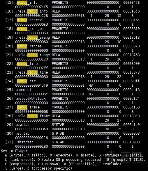 执行"readelf -S test.ko"可以发现,不加-g编译,test.ko就已经包含debug_info节区了,节区数量也不比加了-g编译少: