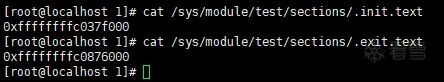 其中,0xffffffffc037f000是test_init()函数的加载地址,0xffffffffc0876000是test_exit()函数的加载地址,这可以在test.ko卸载之前,通过以下3种方式证实: