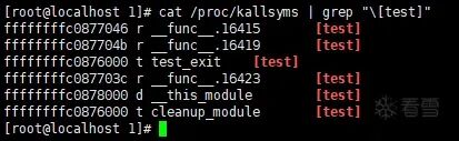 不过还是被我冷静的发现,开始执行"cat /proc/kallsyms"时,除了没看到"test_init",也没看到"test"。