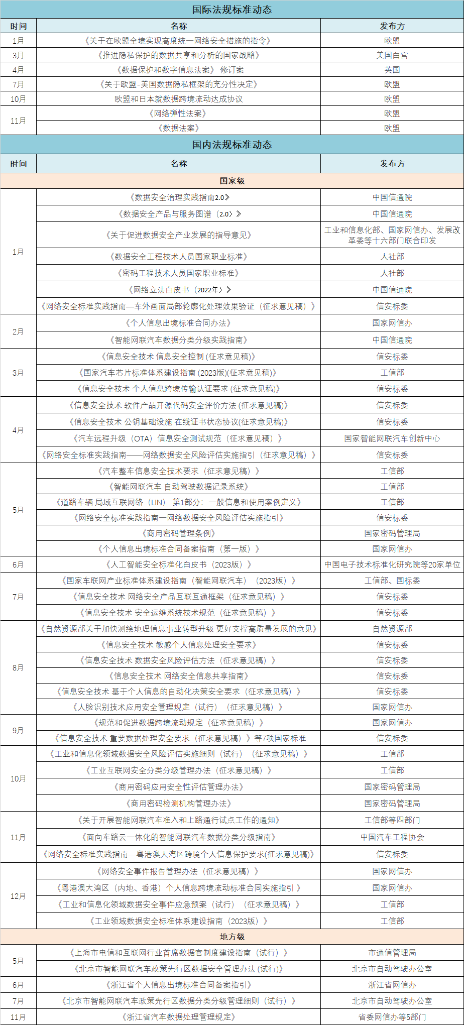 2023年,是汽车网络安全领域法规标准建设持续发展的一年。国际上,欧盟先后发布的《网络弹性法案》、《数据法案》成为我国车企制定出海战略时必须要考量的一道法规关卡;国内,网信办、工信部、信安标委等部委及地方政府也在“三大上位法”的基础上出台了一系列汽车网络安全相关的标准与指南。