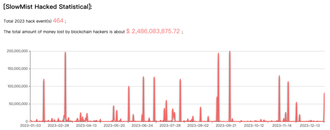 根据慢雾区块链被黑事件档案库(SlowMist Hacked) 统计,2023 年安全事件共 464 件,损失高达 24.86 亿美元。对比 2022 年,安全事件共 303 件,损失约 37.77 亿美元,2023 年的损失同比下降 34.2%,安全事件数量同比上升了约 53.13%。尽管损失有所降低,但安全事件的数量却呈上升趋势。