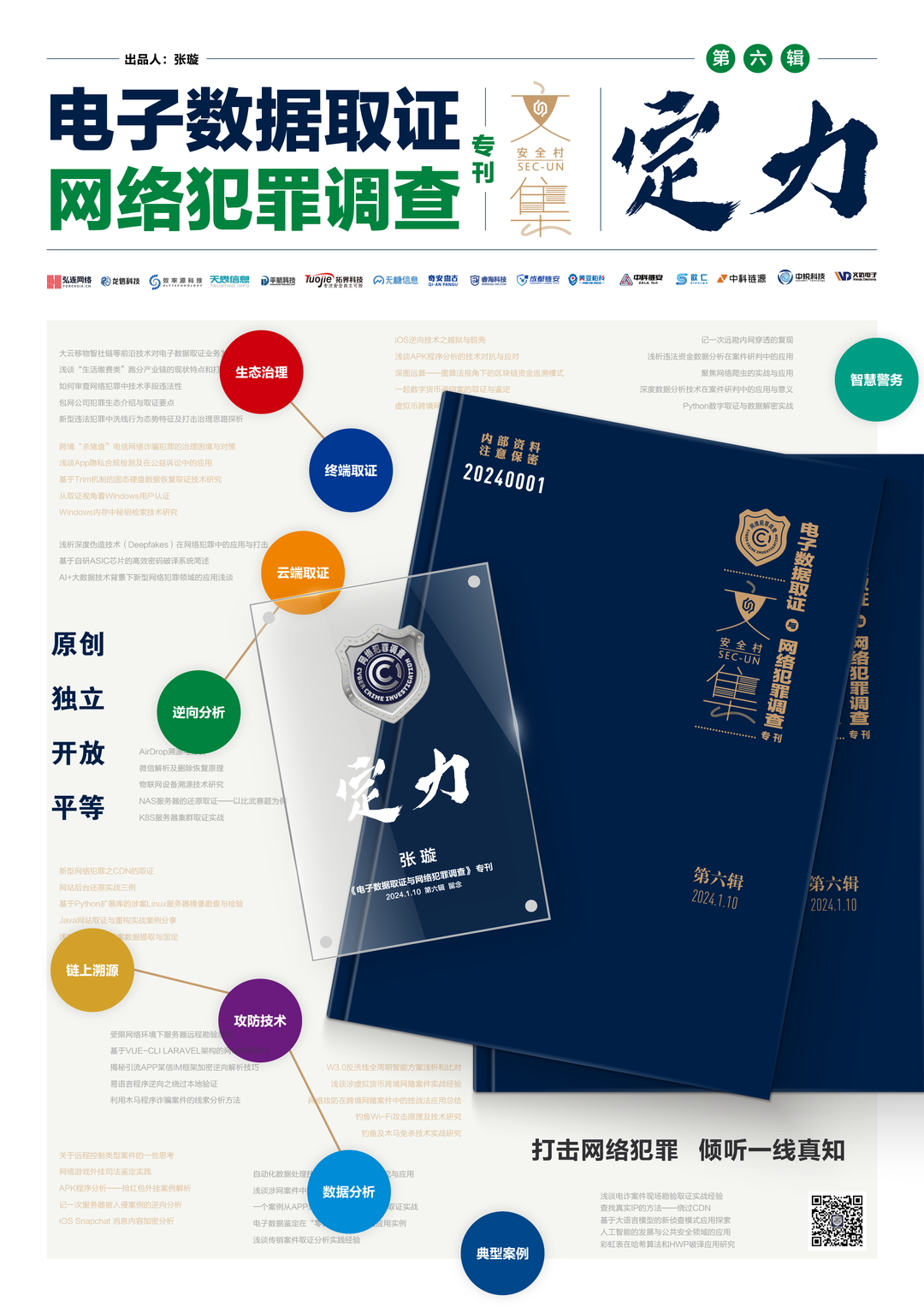 在广大专业人士和学者热切期待中,由山东警察学院的资深教授张璇老师主编,汇集众多领域内的取证专家和安全领域权威的《电子数据取证与网络犯罪调查专刊》第六辑,于“1.10警察节”隆重面世。