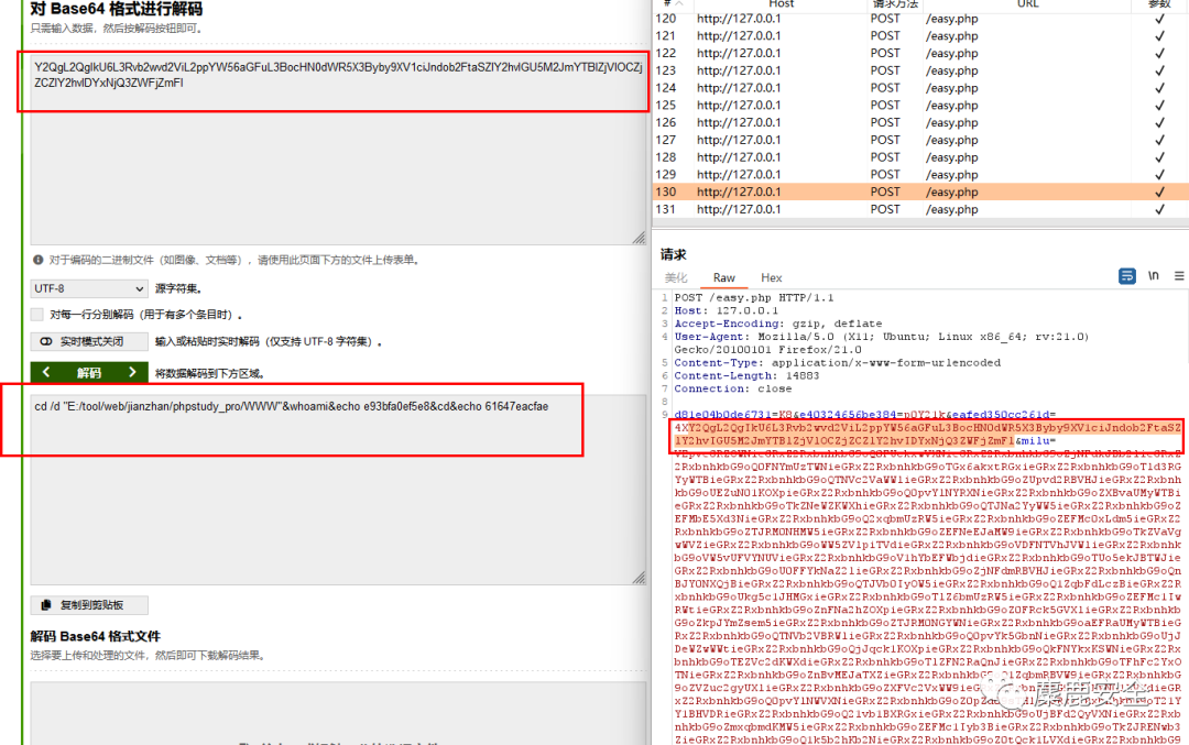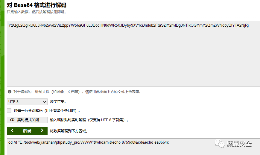 dRY2QgL2QgIkU6L3Rvb2wvd2ViL2ppYW56aGFuL3BocHN0dWR5X3Byby9XV1ciJndob2FtaSZlY2hvIDg3NTlkOGYmY2QmZWNobyBlYTA2NjRj是不是很眼熟?这不就是default里的流量吗?去掉前俩个字符然后base64解密