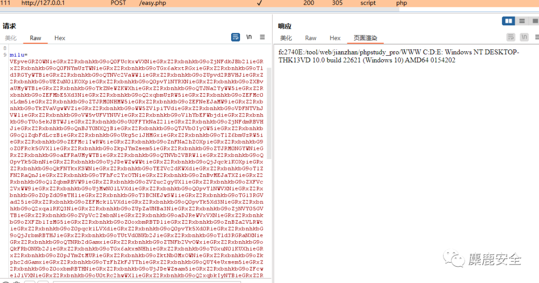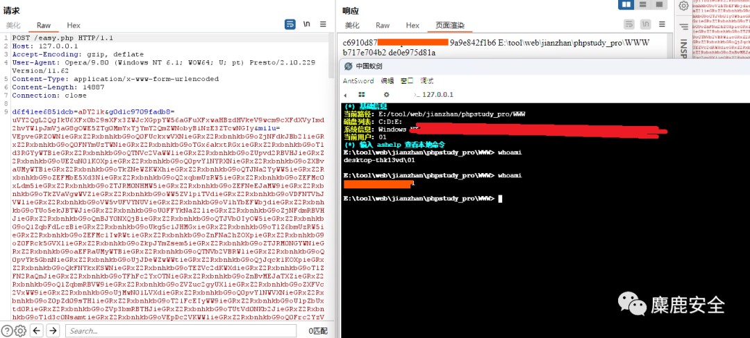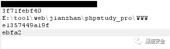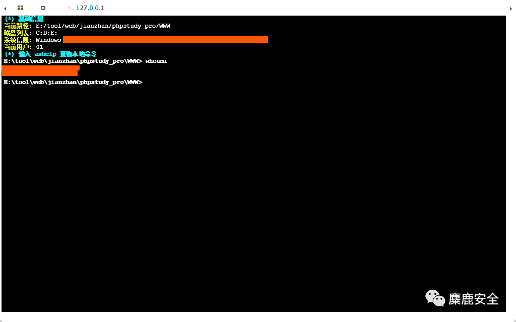 cd /d "E:\\tool\\web\\jianzhan\\phpstudy_pro\\WWW"&whoami&echo 3f71febf40&cd&echo e1357449a19f看一下返回结果(黑色打码部分为麋鹿的电脑名)