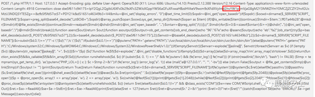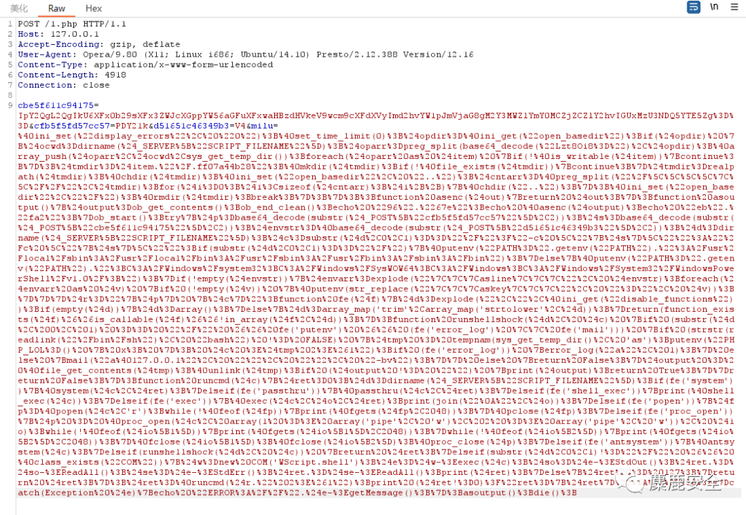 cbe5f611c94175=IpY2QgL2QgIkU6XFx0b29sXFx3ZWJcXGppYW56aGFuXFxwaHBzdHVkeV9wcm9cXFdXVyImd2hvYW1pJmVjaG8gM2Y3MWZlYmY0MCZjZCZlY2hvIGUxMzU3NDQ5YTE5Zg==首先cbe5f611c94175是随机生成的字符串,然后在下面这段代码里提到了对上述字符串的解码过程