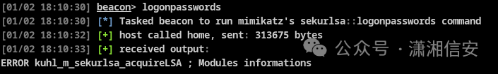 当我们尝试使用内置Mimikatz命令提取凭据时,无法访问该进程。